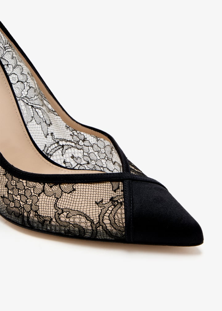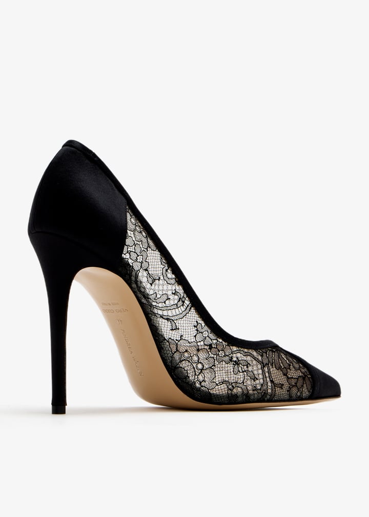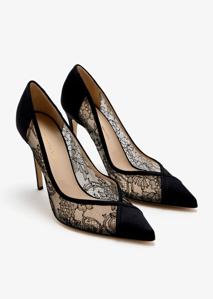 Wear for parties and more, Andrea Wazen presents the Nora pumps—a delicate, feminine pair with a timeless allure. Crafted in delicate lace and soft tonal satin, they're designed in a neat pointed toe with a leather sole and a slim stiletto heel.