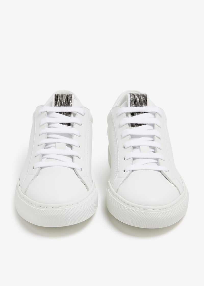 Brunello Cucinelli has you covered on your classic essentials with these sneakers. Made from matte finish calfskin, these sneakers are finished with an insert entirely embroidered with thin rows of shiny monili that stands out on the tongue creating a fine sparkling effect.