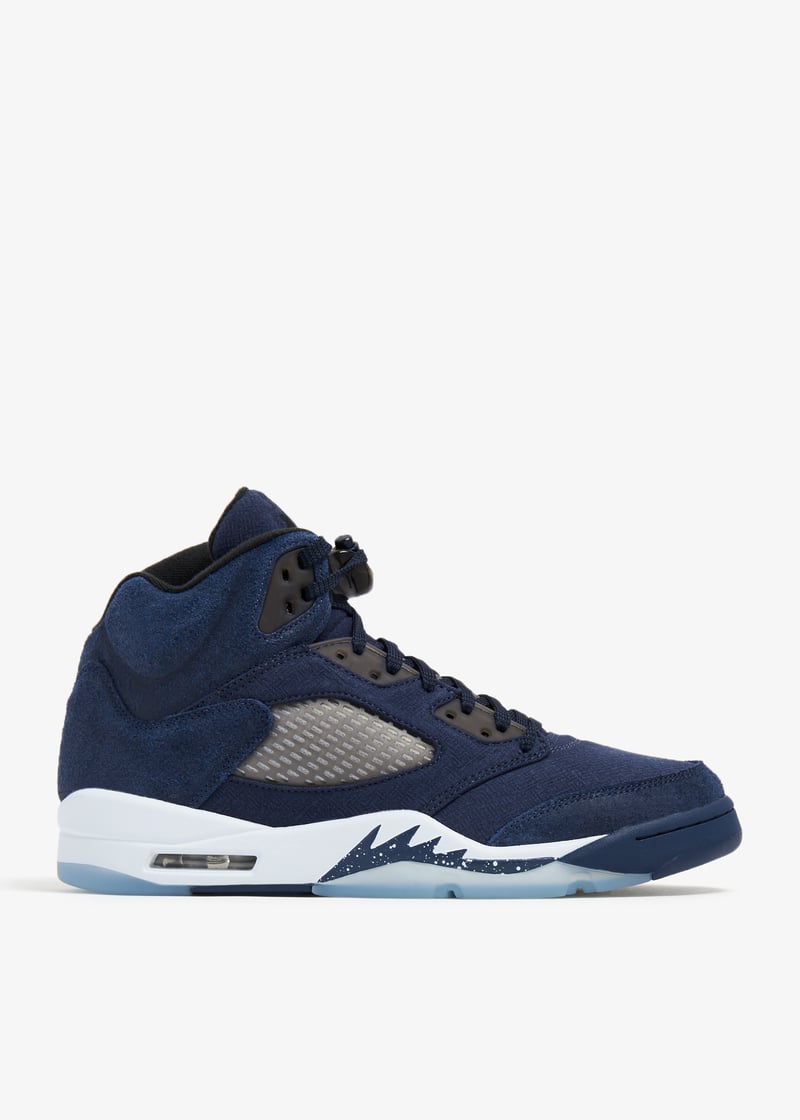 The Air Jordan 5 sneakers arrive in this 'Georgetown' colourway with a blue suede upper and contrasting accents on the Jumpman tongue, inner tongue, lace lock, midsole, and Jumpman on the heel. They're finished with silver 3M reflective tongues atop an icy translucent outsole.
