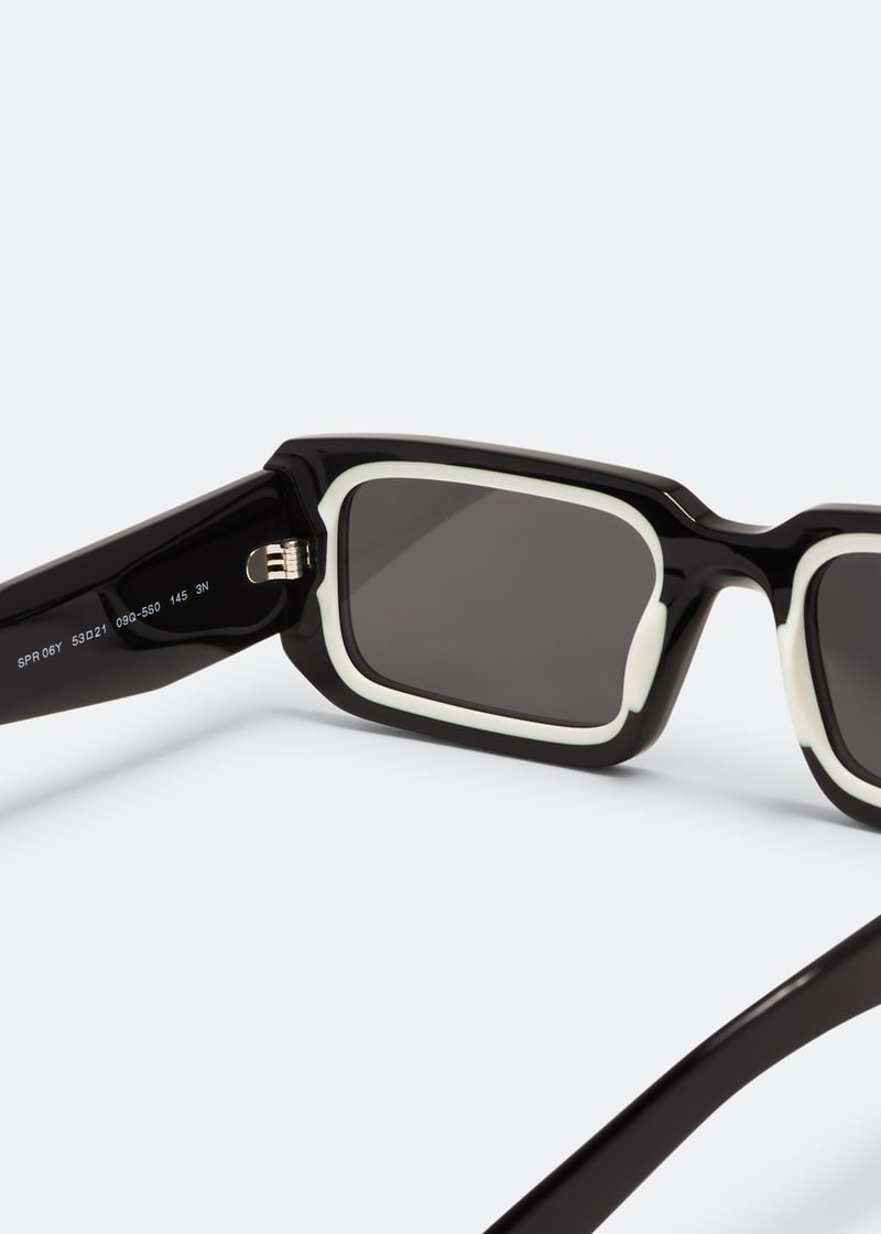 The Prada Symbole sunglasses offer a bold, rectangular design with a contrasting detail on the lens and logo at the oversized temples. They're fitted with 100% UVA/UVB-protective lenses. This frame is compatible with graduated lenses.