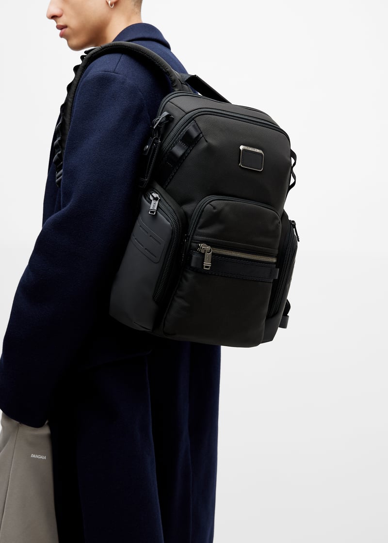 Modern and versatile, this Alpha Bravo Navigation backpack from TUMI is the ultimate everyday bag. It's ideal for commutes to work or school, and for travels that take you further afield. Zipper expansion allows for extra room when needed, and a multitude of organizational pockets for everything from your laptop to your phone ensures you can easily pack it all in and carry it in comfort. The addition of interior and exterior daisy chains makes it compatible with TUMI+ accessories to further enhance its functionality. It opens to two card slots, three media pockets, a zip pocket, a padded tablet pocket, a key leash and a pen holder. Key exterior features include a back padded zip compartment that fits a 16" laptop, a top carry handle with a leather accent, zip expansion, a front U zip pocket, front zip pocket, two side zip pockets, a back quick access pocket with a hidden magnetic snap, and a luggage tag.