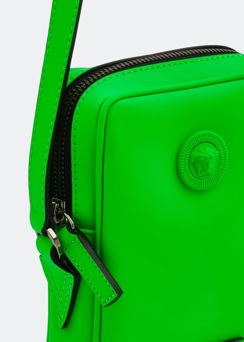 Featuring a smooth rubber finish, this Medusa Biggie small crossbody bag by Versace is designed to have a rectangular silhouette. Key details include a tonal rendition of the signature hardware, a detachable shoulder strap, and a top zip closure.